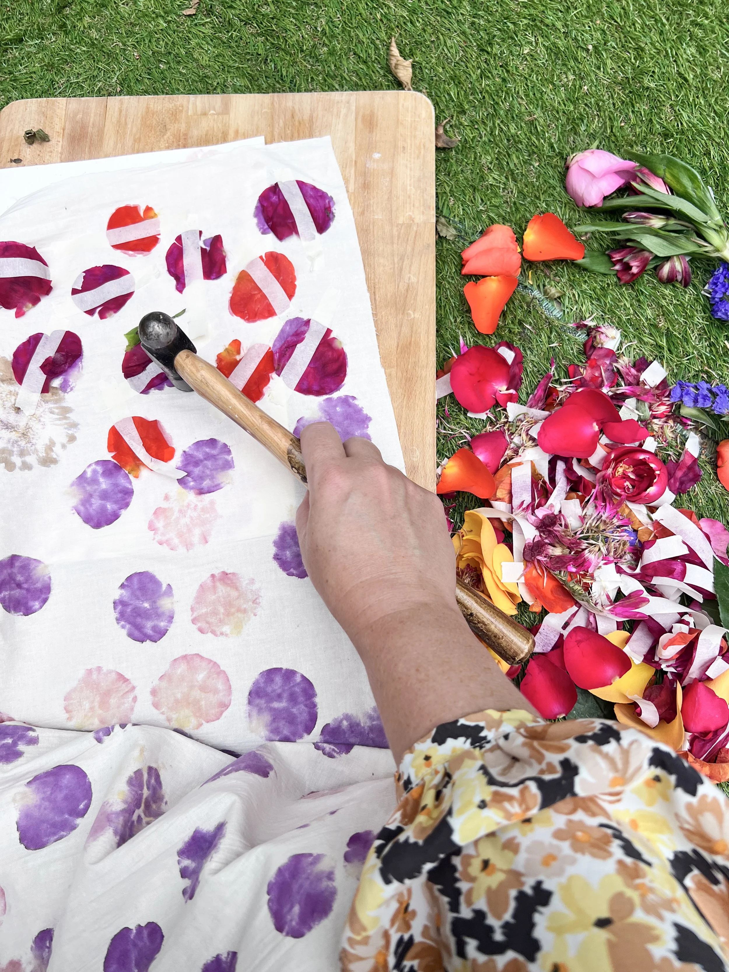 Flower hammering harnesses the natural dyes within flower petals to create unique transferred designs. In this workshop, you'll learn to craft your own design through the following steps: